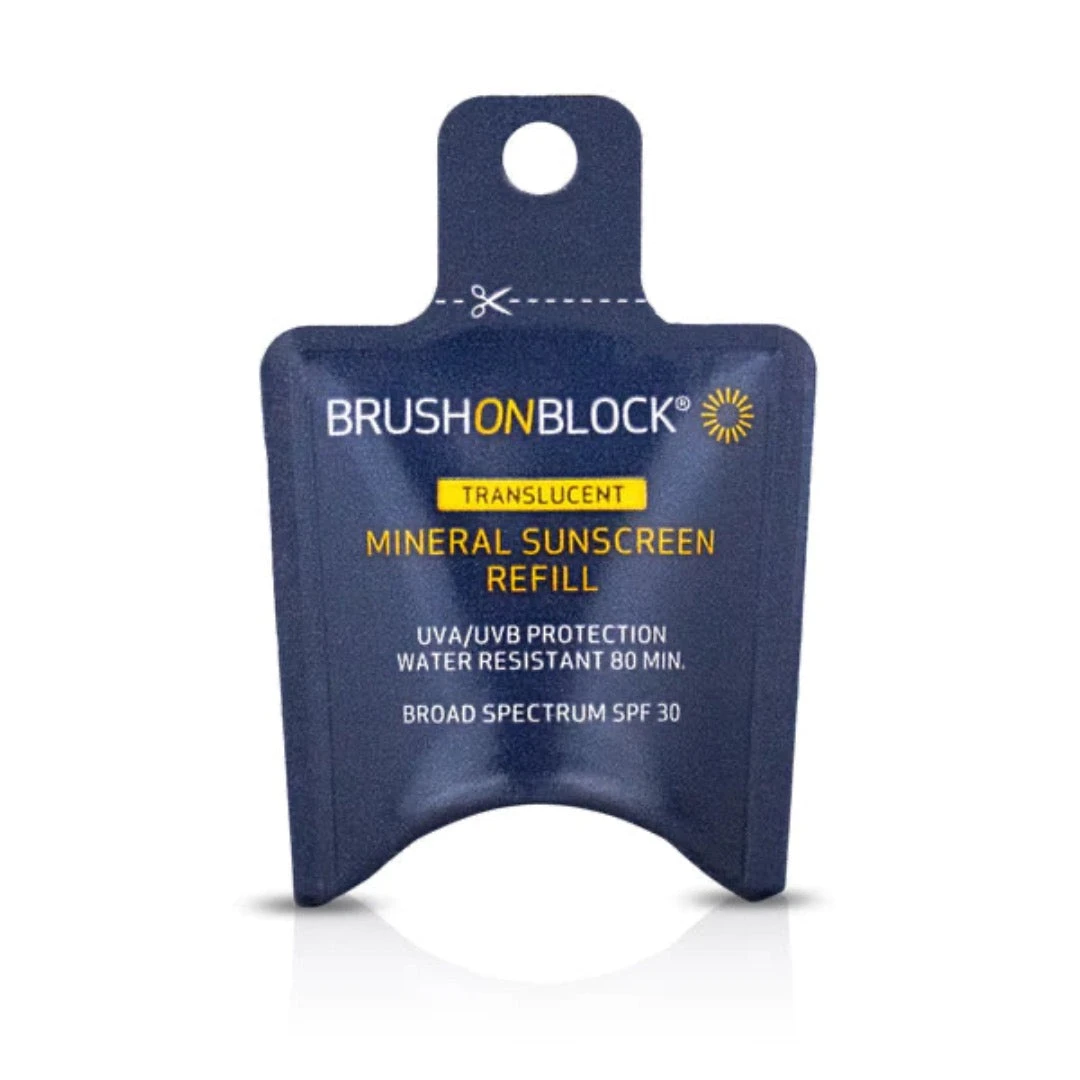 Refill your favourite high-protection sunscreen with Brush On Block Brush Eco-Friendly Pouch Mineral Sunscreen SPF30 Refill Translucent. Containing mineral active sunscreen ingredients titanium dioxide and zinc dioxide to provide natural sun protection that you simply brush on, and when used as directed, provides some of the safest sun protection available. Featuring an easy, self-dispensing brush and a translucent coverage means it can be reapplied on top of make-up and be taken everywhere for effortless on-the-go protection whenever you need it. Water-resistant for up to 80 minutes, it is perfect for daily activities including swimming, walking, and running, and has been formulated without any chemical sunscreen actives, therefore it is safe for both humans and marine life. Vegan, cruelty-free, and gluten-free.