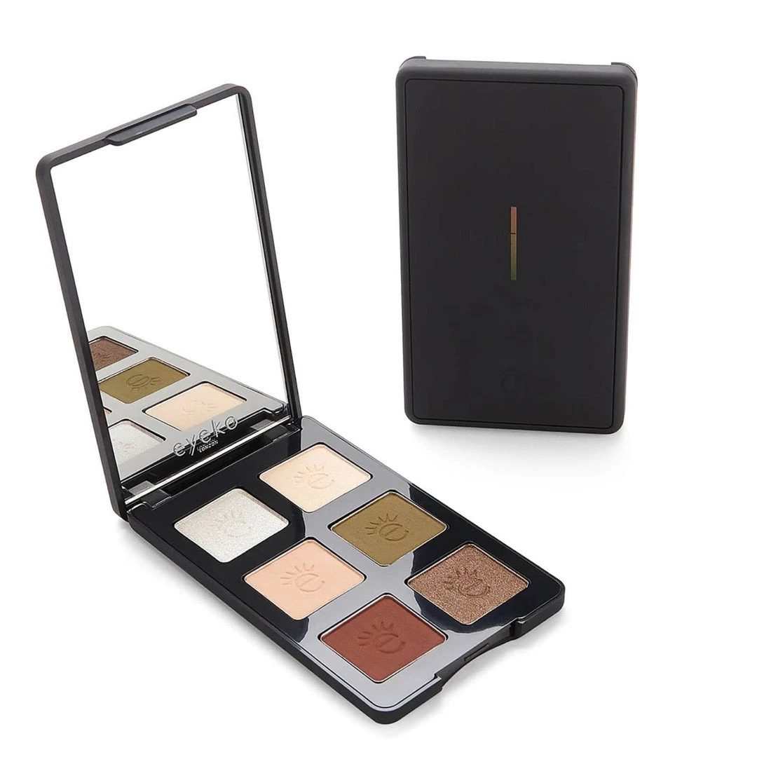 Designed for easy application and effortless on-the-go touch-ups, Eyeko Limitless Eyeshadow Palette 1 features six shadows contained in a chic compact that includes a mirror. Nude tones are complemented by a deeper brown, an olive green, and a khaki-hued gold. Blendable and buildable, the eyeshadows are crease-proof and long-lasting.