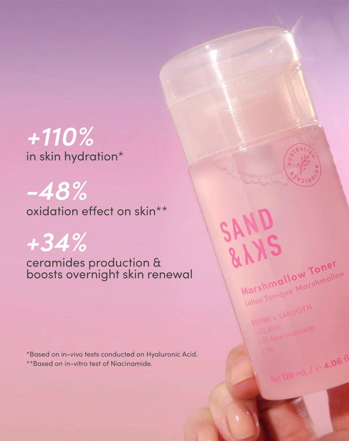 The Sand & Sky Marshmallow Toner is perfect for daily use to gently exfoliate your skin and help to target clogged pores. Formulated with an ultra-soothing blend of Marshmallow Extract and Niacinamide, any irritation and skin sensitively will be reduced whilst your skin barrier will be repaired and strengthened.