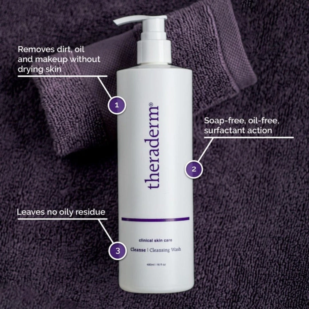 This soap-free, mild foaming gel gently loosens and cleanses the skin of debris, oils and cellular debris without drying the skin. The gentle cleansing action of TheradermĀ® Cleansing Wash purifies and refreshes even the most sensitive of skin, making it the choice for all complexion types. Thearderm Cleansing Wash is the first step step in the Theraderm Skin Renewal System, a simple, daily regimen developed to optimize skin health by enhancing the skinās natural ability to restore itself. The result is younger, healthier-looking skin.